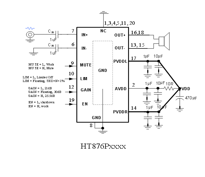 此外,HT876內(nèi)部集成免濾波器調(diào)制技術(shù),能夠直接驅(qū)動(dòng)揚(yáng)聲器,內(nèi)置的關(guān)斷功能使待機(jī)電流最小化,還集成了輸出端過(guò)流保護(hù)、片內(nèi)過(guò)溫保護(hù)和電源欠壓異常保護(hù)等功能。