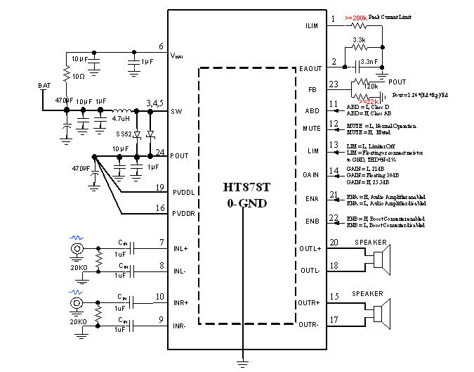 此外,HT878T內(nèi)部集成免濾波器調(diào)制技術(shù),能夠直接驅(qū)動(dòng)揚(yáng)聲器,內(nèi)置的關(guān)斷功能使待機(jī)電流最小化,還集成了輸出端過(guò)流保護(hù)、片內(nèi)過(guò)溫保護(hù)和電源欠壓異常保護(hù)等功能。