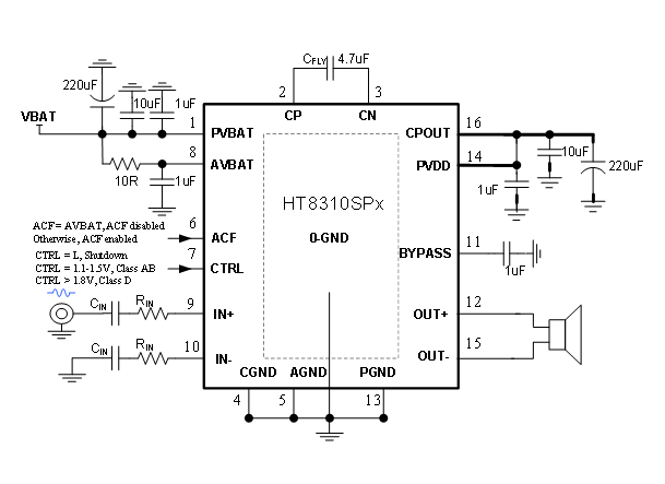 HT8310具有AB類和D類的自由切換功能,在受到D類功放EMI干擾困擾時,可隨時切換至AB類音頻功放模式(此時電荷泵升壓功能關閉)。