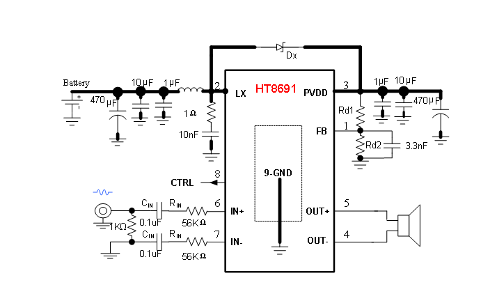 HT8691內(nèi)部集成免濾波器數(shù)字調(diào)制技術(shù),能夠直接驅(qū)動(dòng)揚(yáng)聲器,并最大程度減小脈沖輸出信號(hào)的失真和噪音。輸出無(wú)需濾波網(wǎng)絡(luò),極少的外部元器件節(jié)省了系統(tǒng)空間和成本,是便攜式應(yīng)用的理想選擇。此外,HT8691內(nèi)置的關(guān)斷功能使待機(jī)電流最小化,還集成了輸出端過(guò)流保護(hù)、片內(nèi)過(guò)溫保護(hù)和電源欠壓異常保護(hù)等功能。