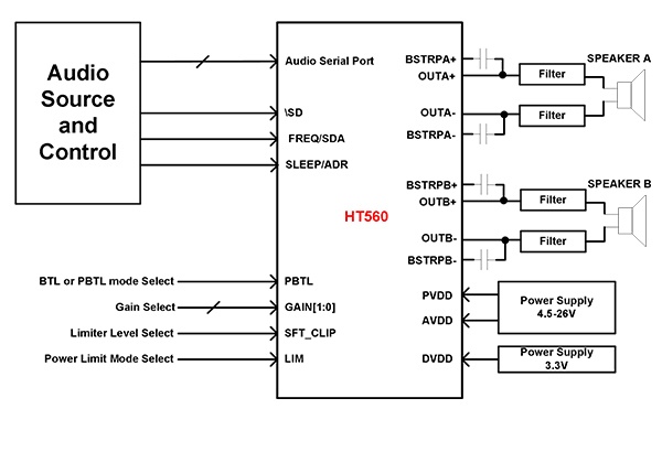 HT560是一款高效I2S輸入D類立體聲音頻功率放大器。HT560可選硬件或者軟件I2C控制。在BTL模式,能夠提供2*30W/8Ω功率輸出;在PBTL模式,能夠提供75W/4Ω功率輸出。