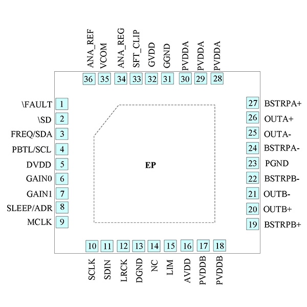 4 | PBTL/SCL | I | 硬件控制模式,PBTL設置控制輸入;軟件I2C模式,SCL時鐘輸入 |