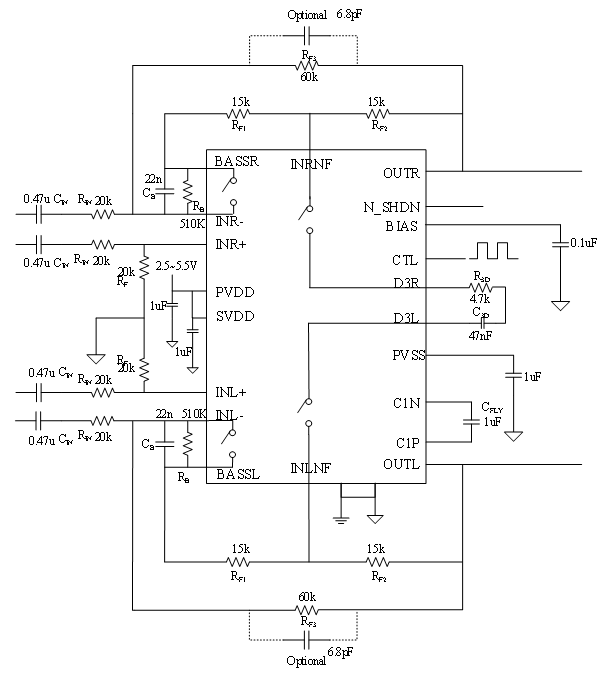 器件具有卓越的3D環(huán)繞技術(shù),以實(shí)現(xiàn)真實(shí)自然的現(xiàn)場(chǎng)環(huán)繞效果。器件還集成了低音增強(qiáng)技術(shù),其可為局部低音提供低失真的增強(qiáng)效果。這兩種功能均可通過(guò)外部電阻、電容參數(shù)進(jìn)行調(diào)節(jié)。